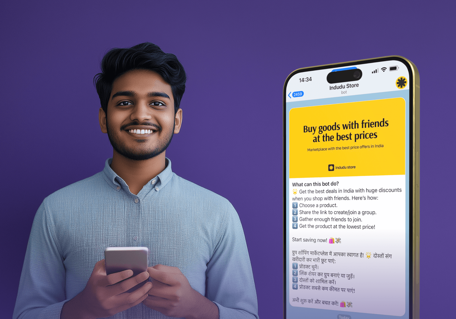 Indudu connects Indian sellers with group buyers via Telegram. Shoppers join groups for wholesale prices on premium products, while sellers boost revenue through volume.